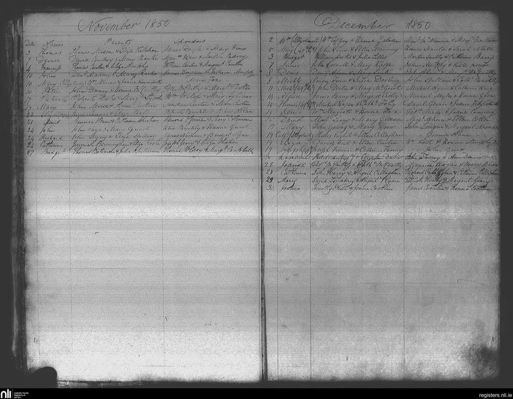 Fermoy; County of Cork; Diocese of Cloyne. Baptisms, Nov. 1850 to Dec. 1850