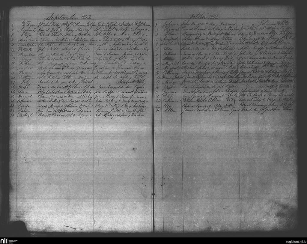 Fermoy; County of Cork; Diocese of Cloyne. Baptisms, Sep. 1852 to Oct. 1852