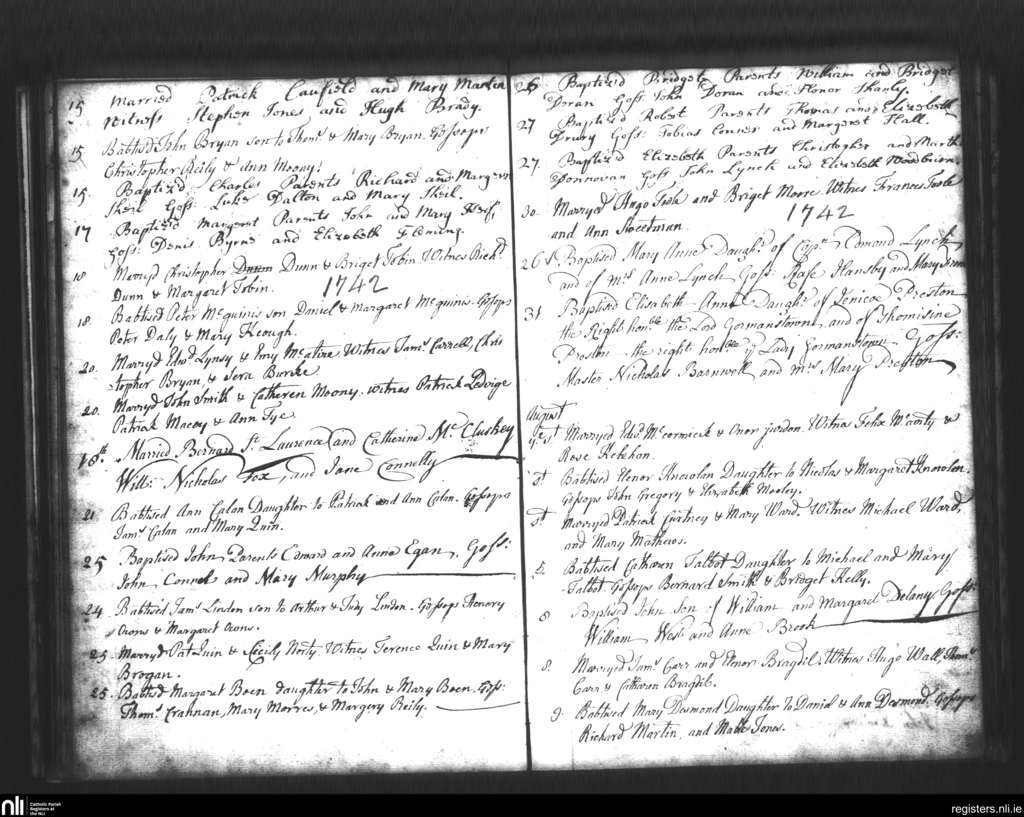 St. Mary's, Dublin city; County of Dublin; Archdiocese of Dublin. Baptisms, Marriages, July 1742 to Aug. 1742