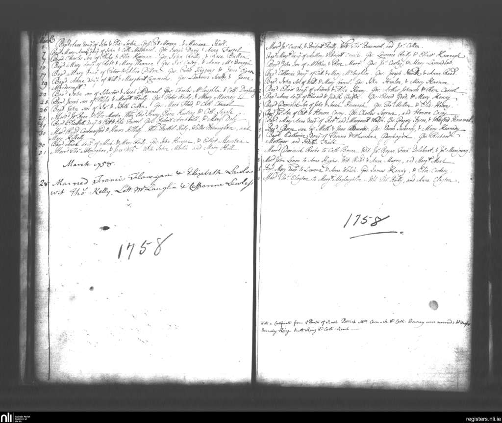 St. Mary's, Dublin city; County of Dublin; Archdiocese of Dublin. Baptisms, Marriages, Mar. 1758 to Apr. 1758