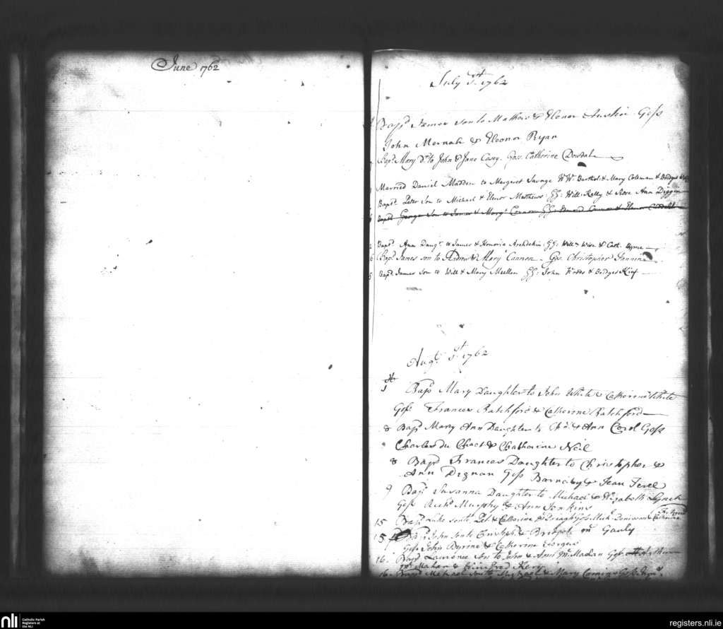 St. Mary's, Dublin city; County of Dublin; Archdiocese of Dublin. Baptisms, Marriages, June 1762 to Aug. 1762