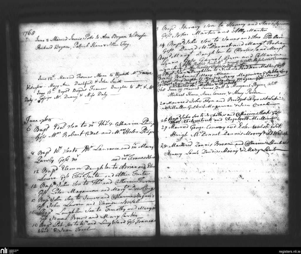 St. Mary's, Dublin city; County of Dublin; Archdiocese of Dublin. Baptisms, Marriages, June 1768