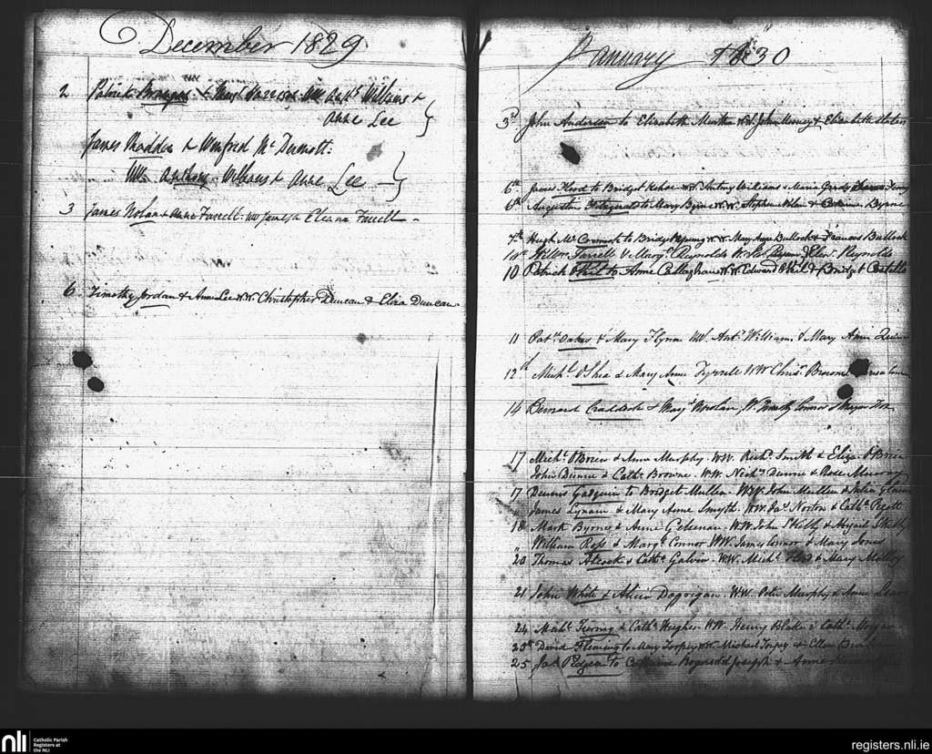 St. Mary's, Dublin city; County of Dublin; Archdiocese of Dublin. Marriages, Dec. 1829 to Jan. 1830