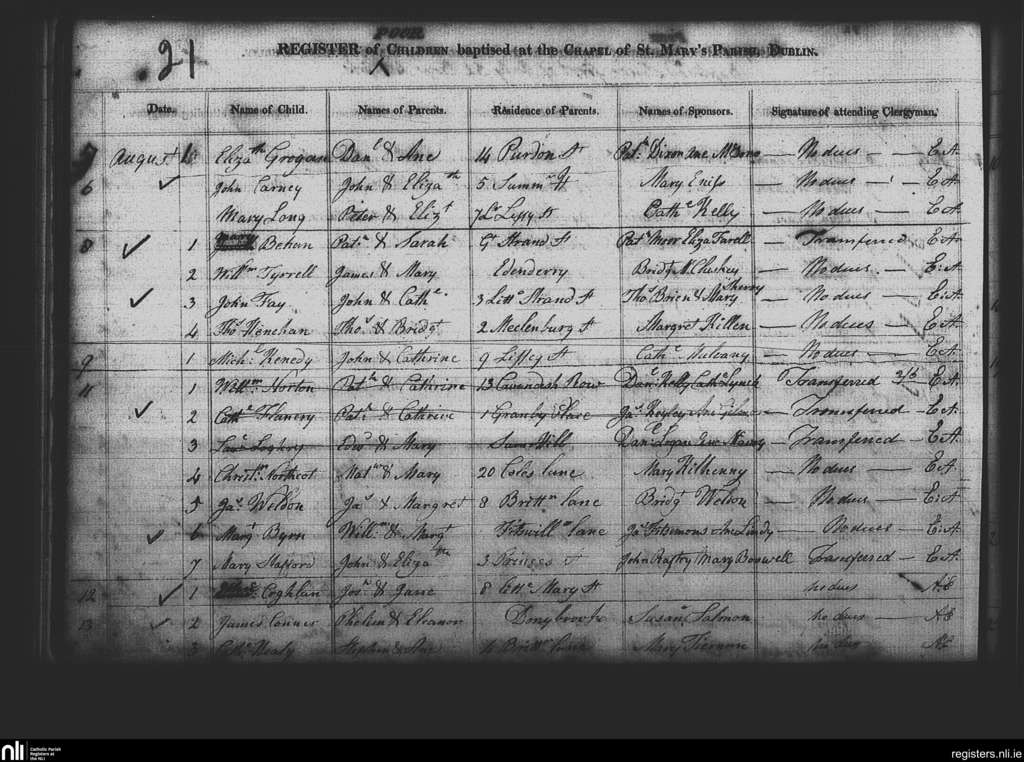 St. Mary's, Dublin city; County of Dublin; Archdiocese of Dublin. Baptisms, Aug. 1817