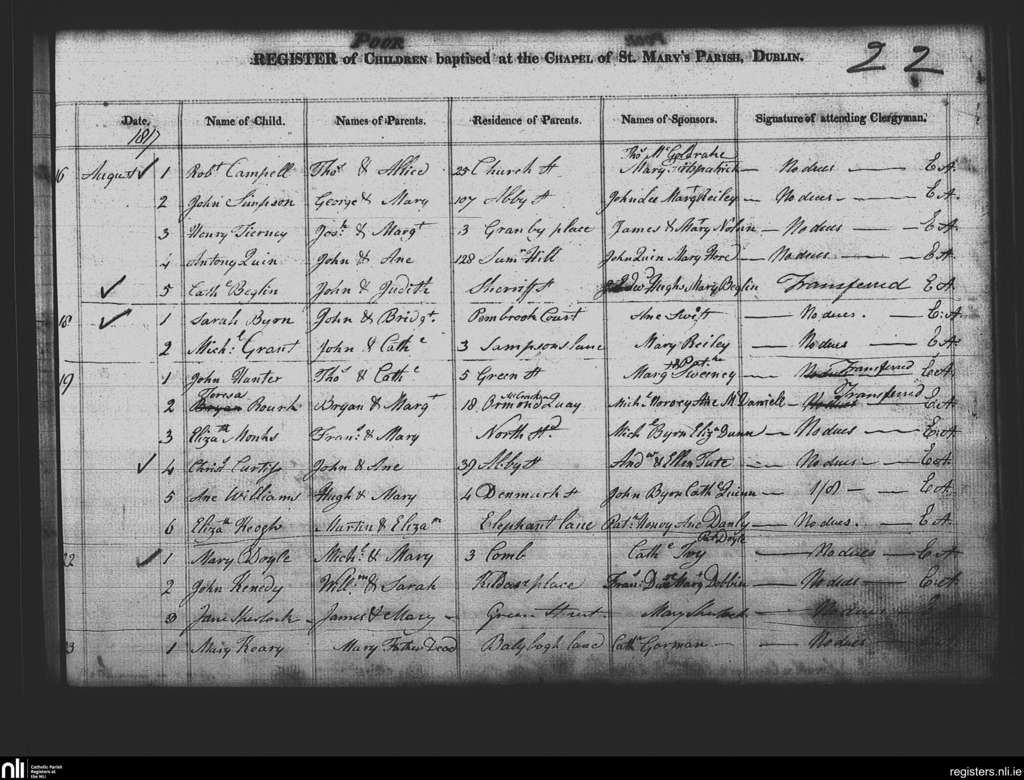 St. Mary's, Dublin city; County of Dublin; Archdiocese of Dublin. Baptisms, Aug. 1817
