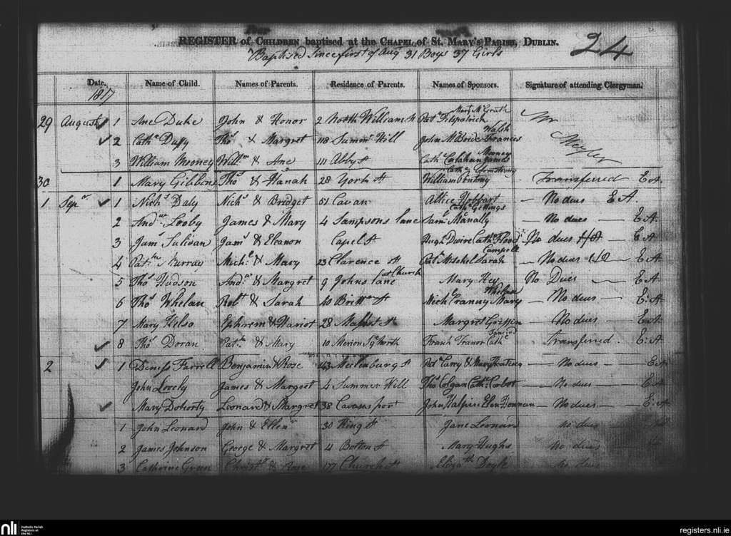St. Mary's, Dublin city; County of Dublin; Archdiocese of Dublin. Baptisms, Aug. 1817 to Sep. 1817
