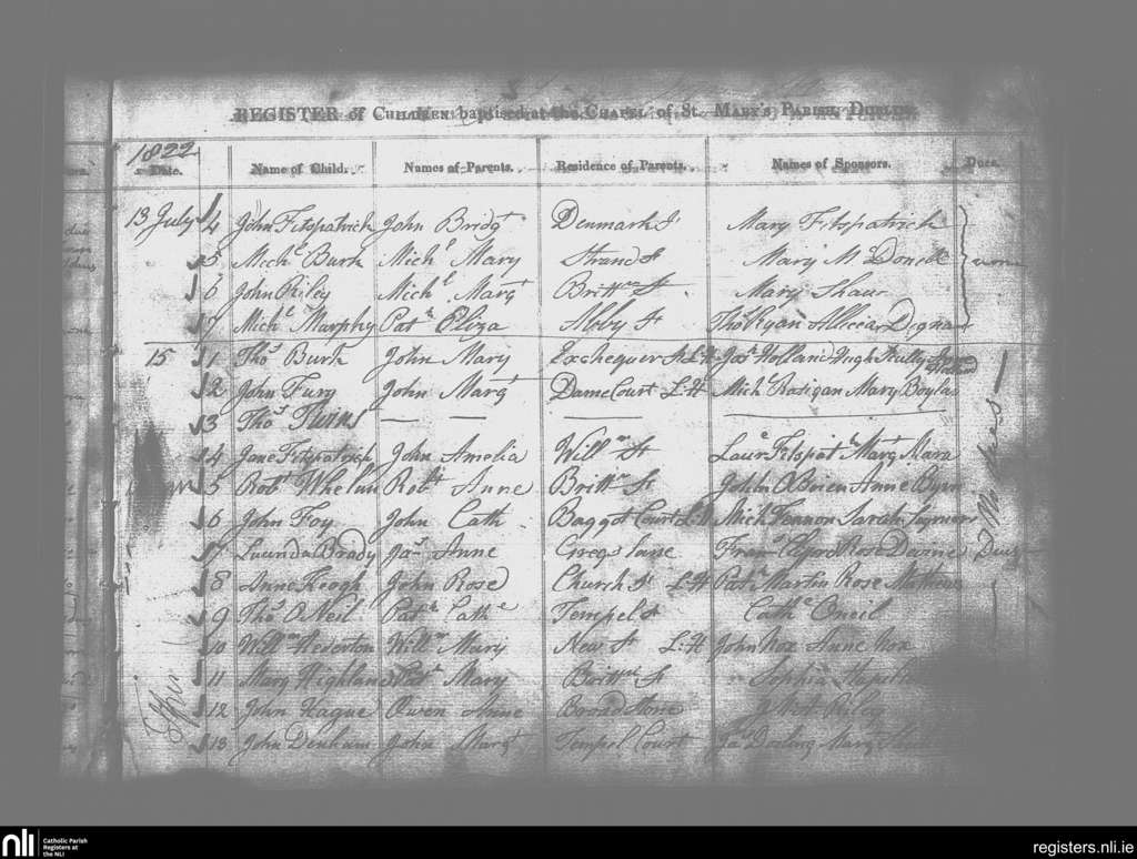 St. Mary's, Dublin city; County of Dublin; Archdiocese of Dublin. Baptisms, July 1822