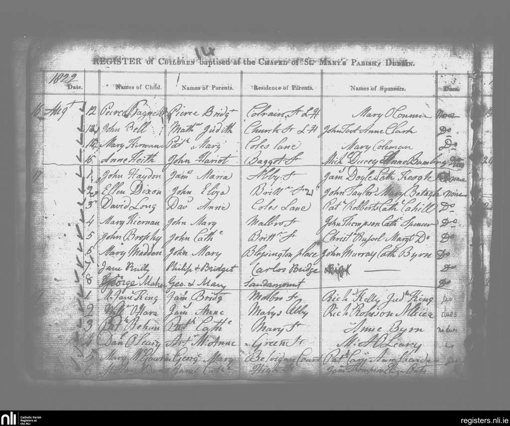 St. Mary's, Dublin city; County of Dublin; Archdiocese of Dublin. Baptisms, Aug. 1822