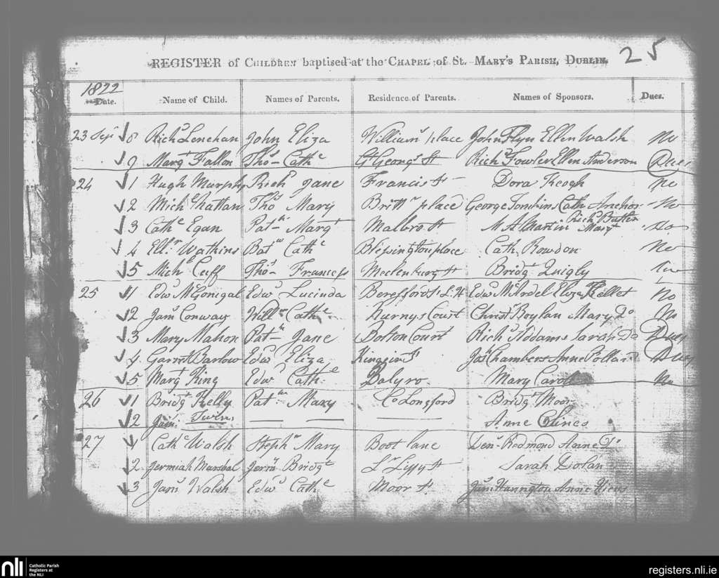 St. Mary's, Dublin city; County of Dublin; Archdiocese of Dublin. Baptisms, Sep. 1822