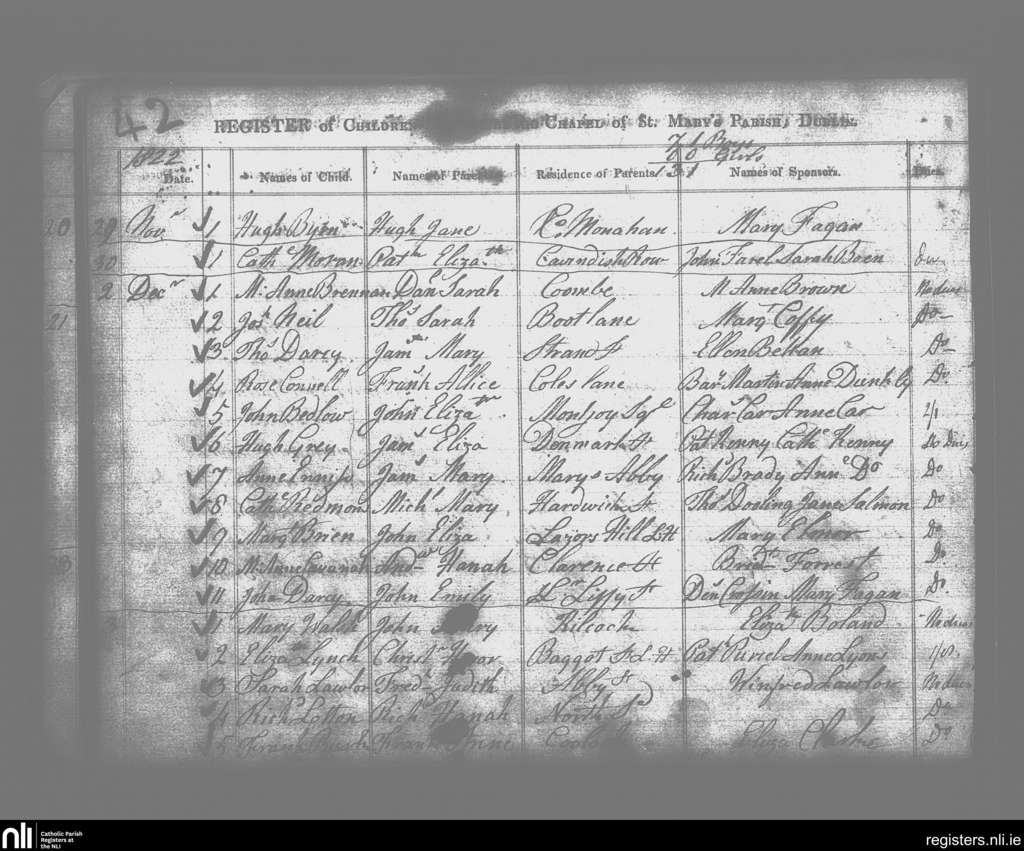 St. Mary's, Dublin city; County of Dublin; Archdiocese of Dublin. Baptisms, Nov. 1822 to Dec. 1822