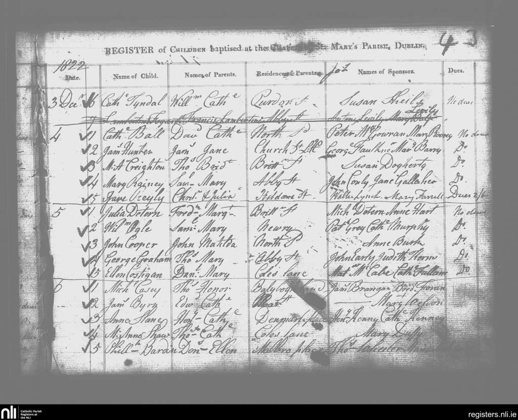 St. Mary's, Dublin city; County of Dublin; Archdiocese of Dublin. Baptisms, Dec. 1822