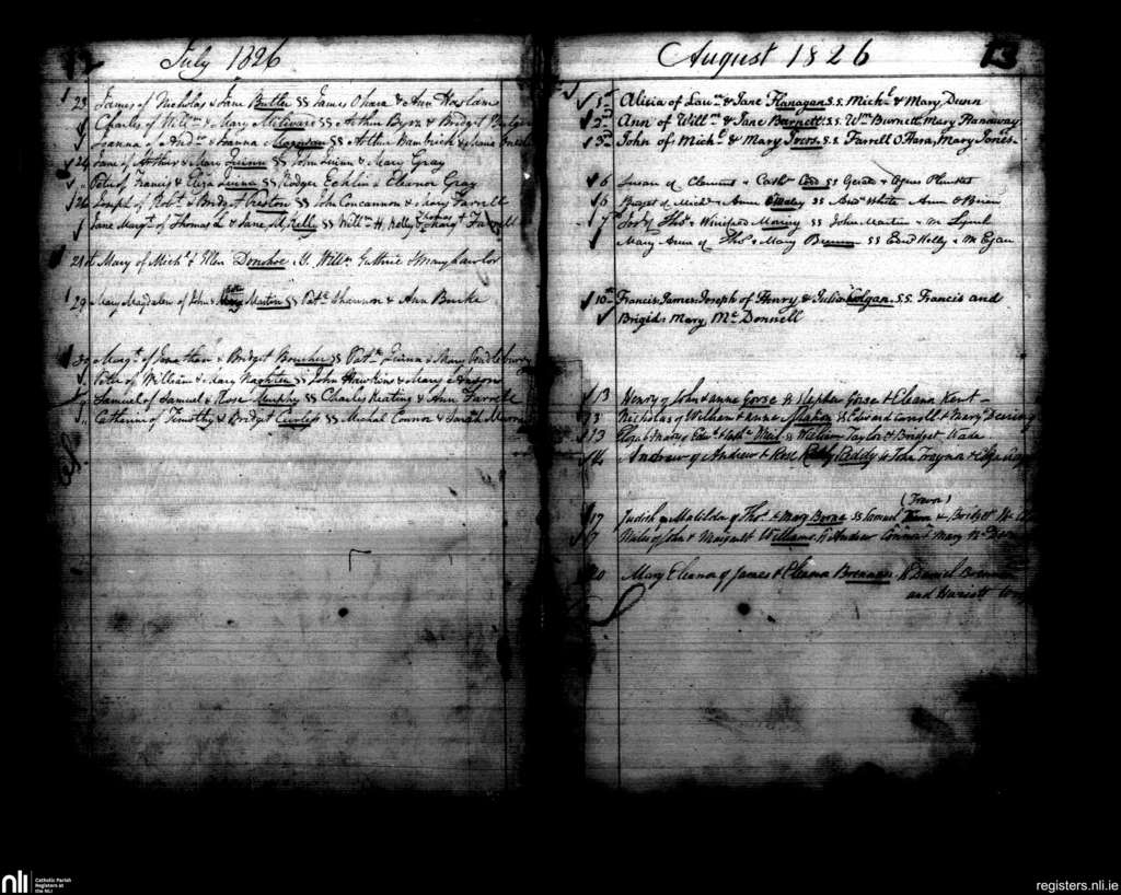 St. Mary's, Dublin city; County of Dublin; Archdiocese of Dublin. Baptisms, July 1826 to Aug. 1826