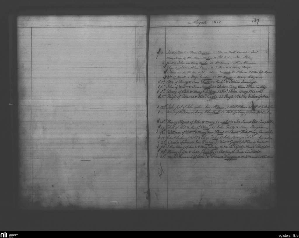 St. Mary's, Dublin city; County of Dublin; Archdiocese of Dublin. Baptisms, Aug. 1827