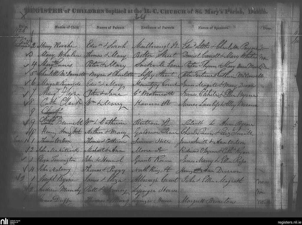 St. Mary's, Dublin city; County of Dublin; Archdiocese of Dublin. Baptisms, May 1826 to June 1826