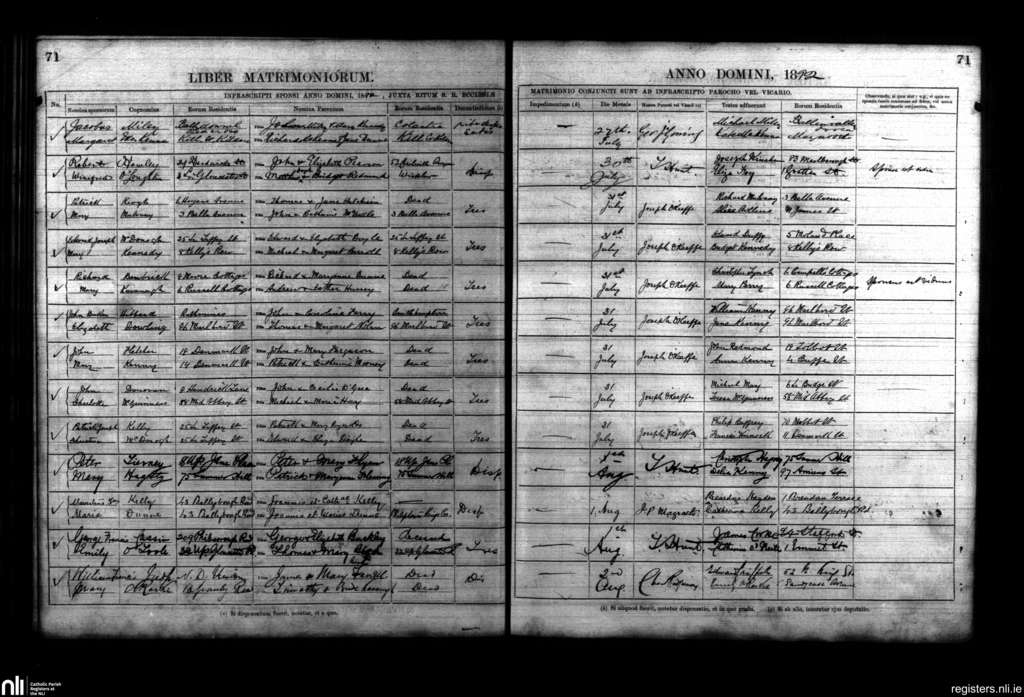 St. Mary's, Dublin city; County of Dublin; Archdiocese of Dublin. Marriages, July 1892 to Aug. 1892