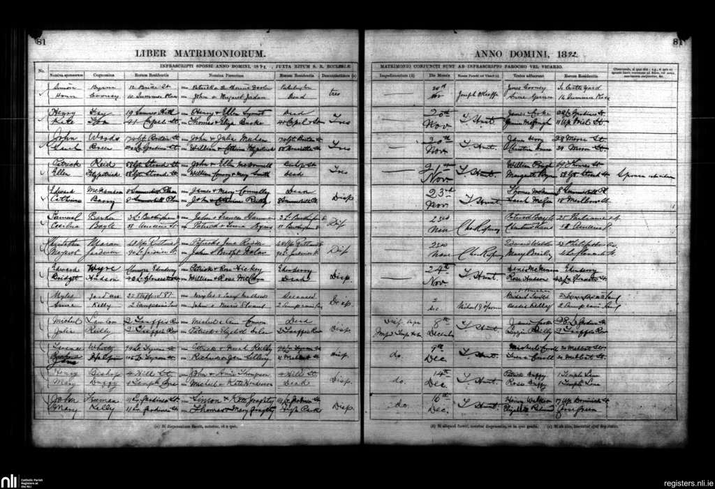St. Mary's, Dublin city; County of Dublin; Archdiocese of Dublin. Marriages, Nov. 1892 to Dec. 1892