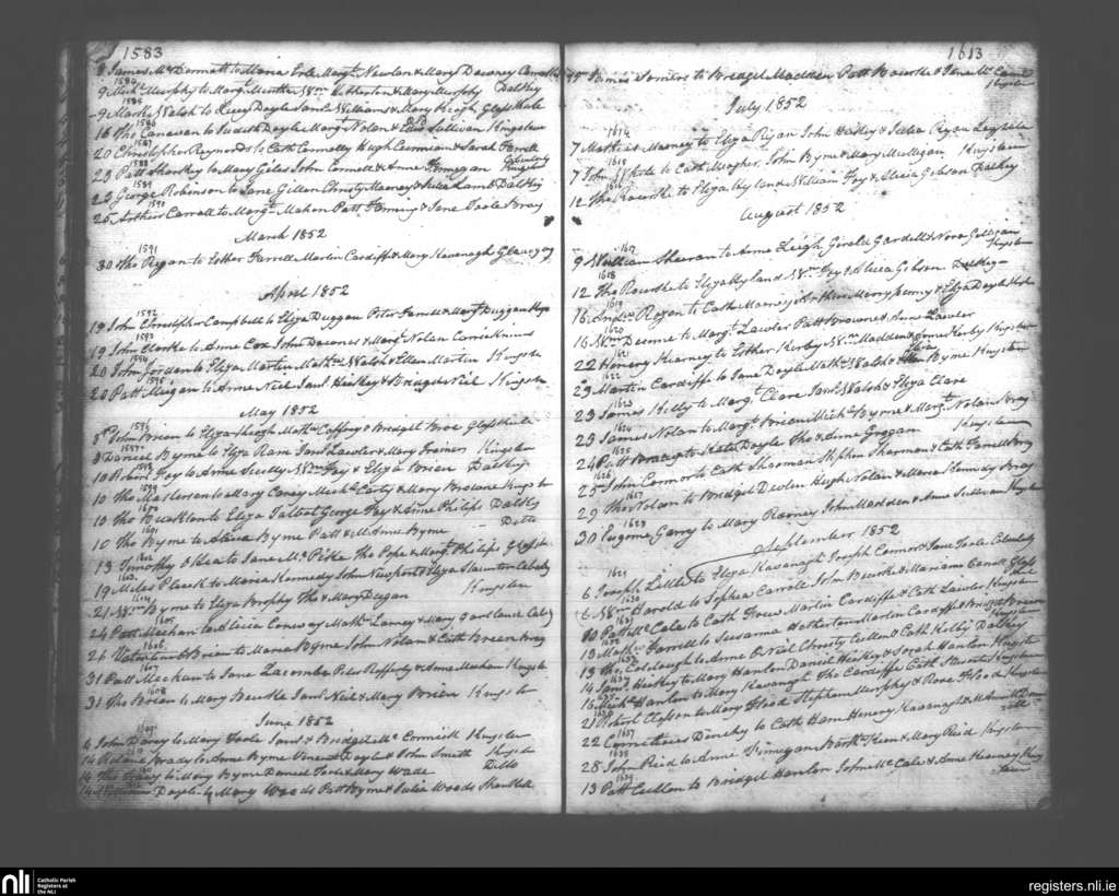 Kingstown; County of Dublin; Archdiocese of Dublin. Marriages, Feb. 1852 to Sep. 1852
