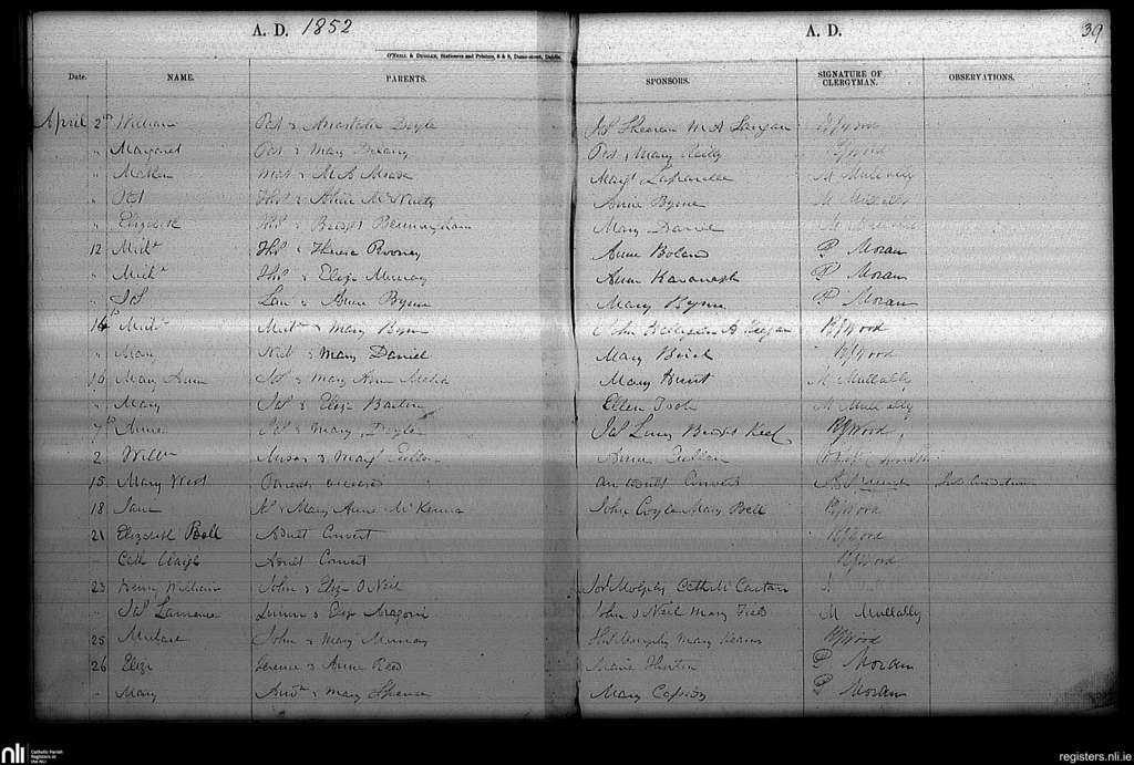 Haddington Road; County of Dublin; Archdiocese of Dublin. Baptisms, Apr. 1852