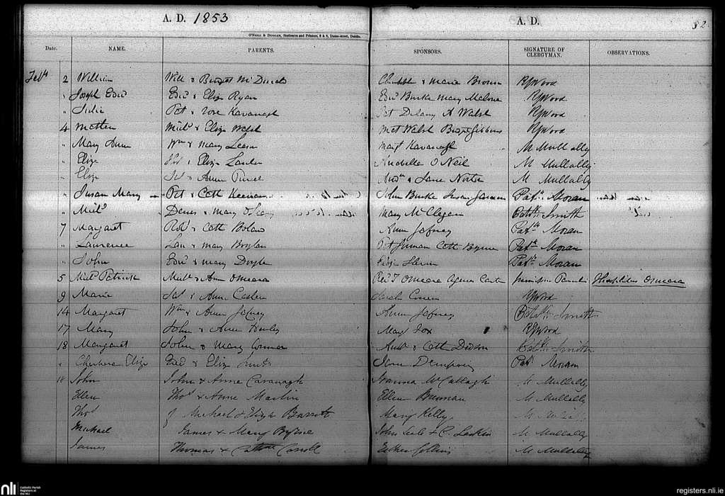 Haddington Road; County of Dublin; Archdiocese of Dublin. Baptisms, Feb. 1853