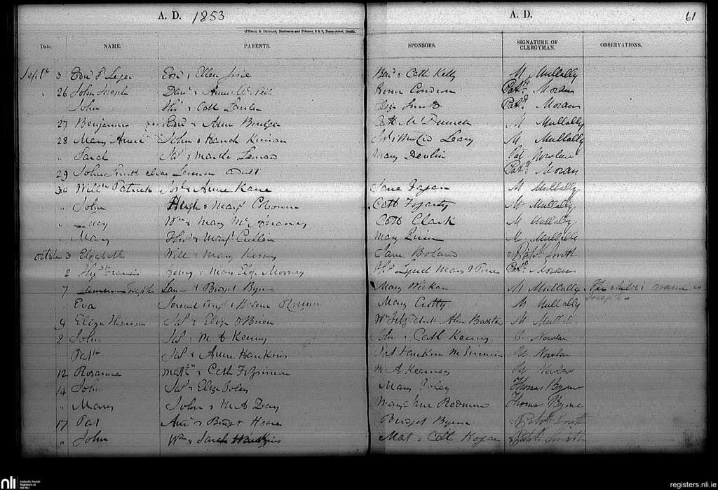 Haddington Road; County of Dublin; Archdiocese of Dublin. Baptisms, Sep. 1853 to Oct. 1853