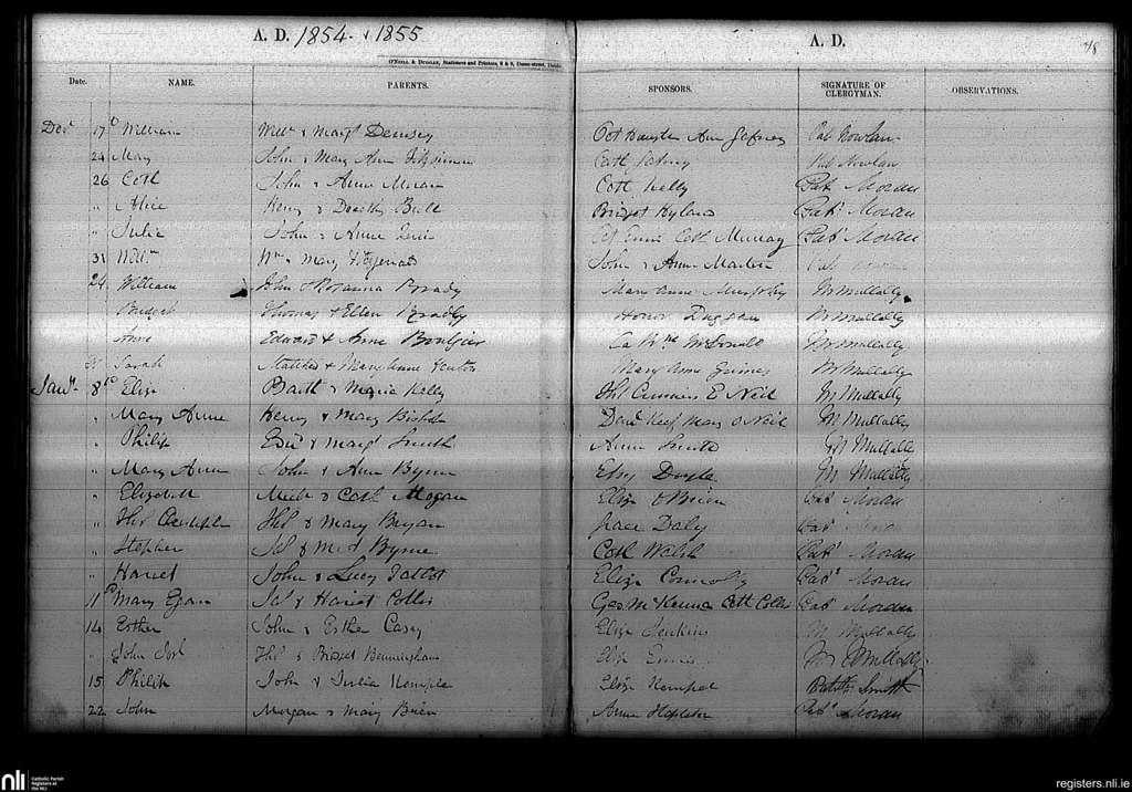 Haddington Road; County of Dublin; Archdiocese of Dublin. Baptisms, Dec. 1854 to Jan. 1855