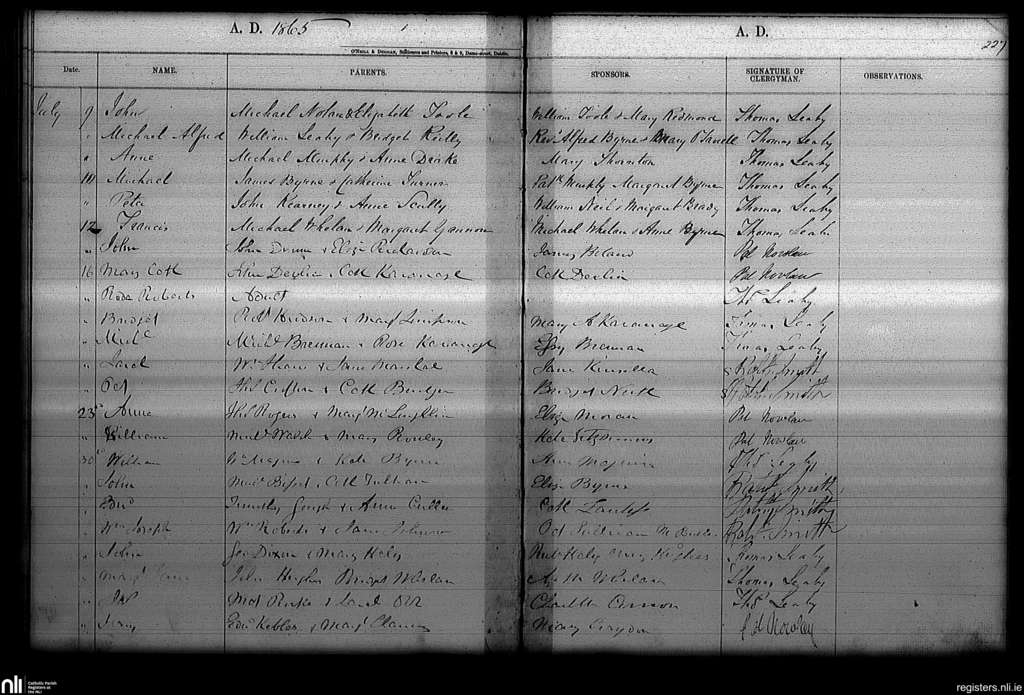 Haddington Road; County of Dublin; Archdiocese of Dublin. Baptisms, July 1865
