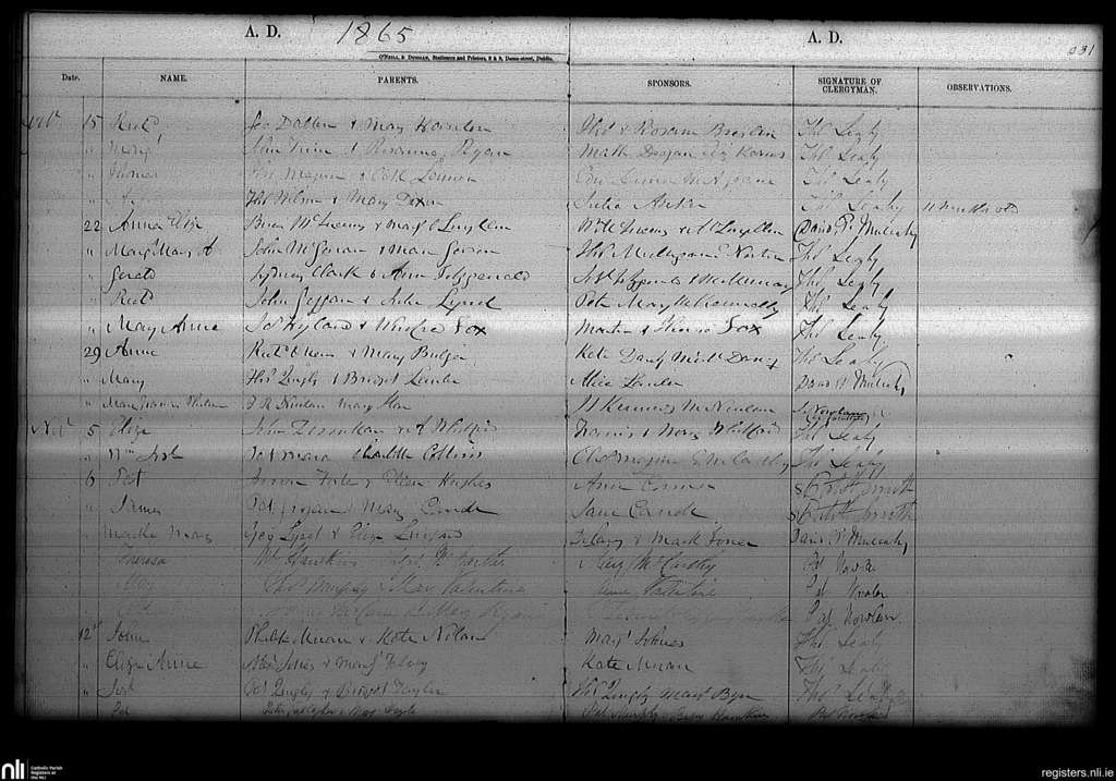 Haddington Road; County of Dublin; Archdiocese of Dublin. Baptisms, Oct. 1865 to Nov. 1865