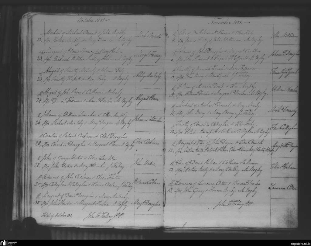 Glanmire; County of Cork; Diocese of Cork and Ross. Baptisms, Oct. 1831 to Nov. 1831