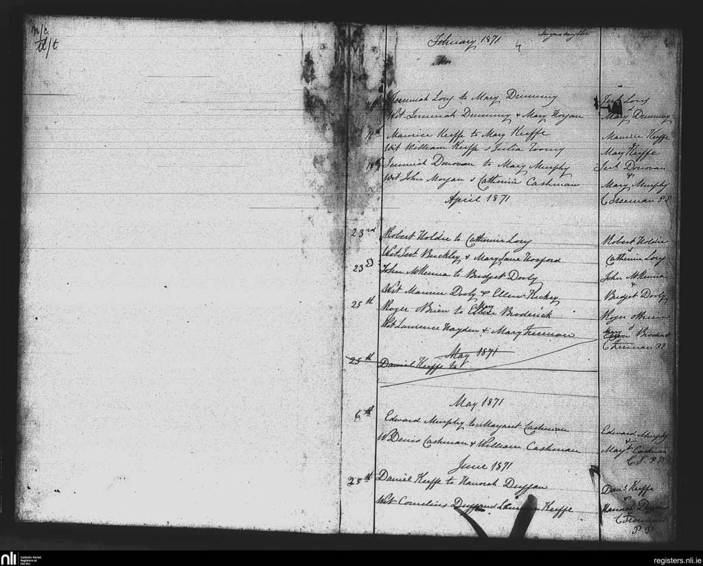 Glanmire; County of Cork; Diocese of Cork and Ross. Marriages, Feb. 1871 to June 1871