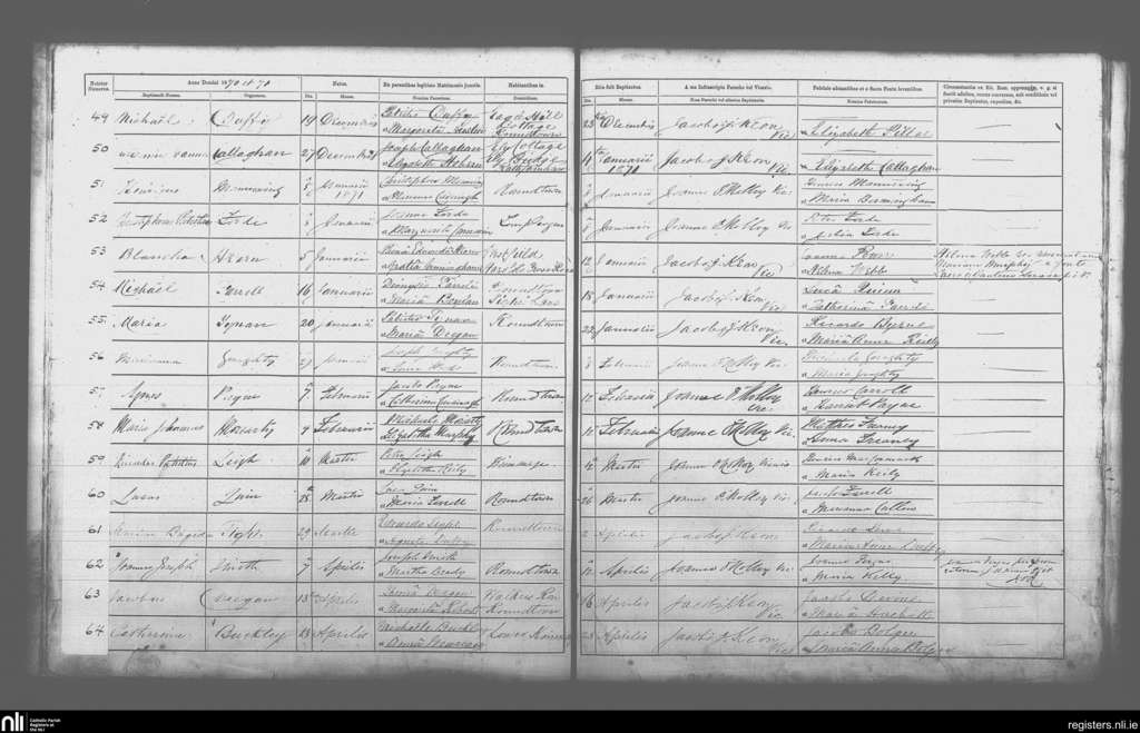 Terenure; County of Dublin; Archdiocese of Dublin. Baptisms, Dec. 1870 to Apr. 1871
