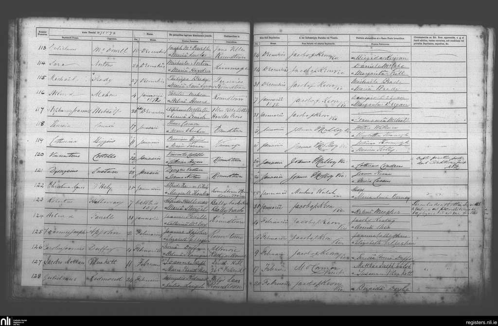 Terenure; County of Dublin; Archdiocese of Dublin. Baptisms, Dec. 1871 to Feb. 1872