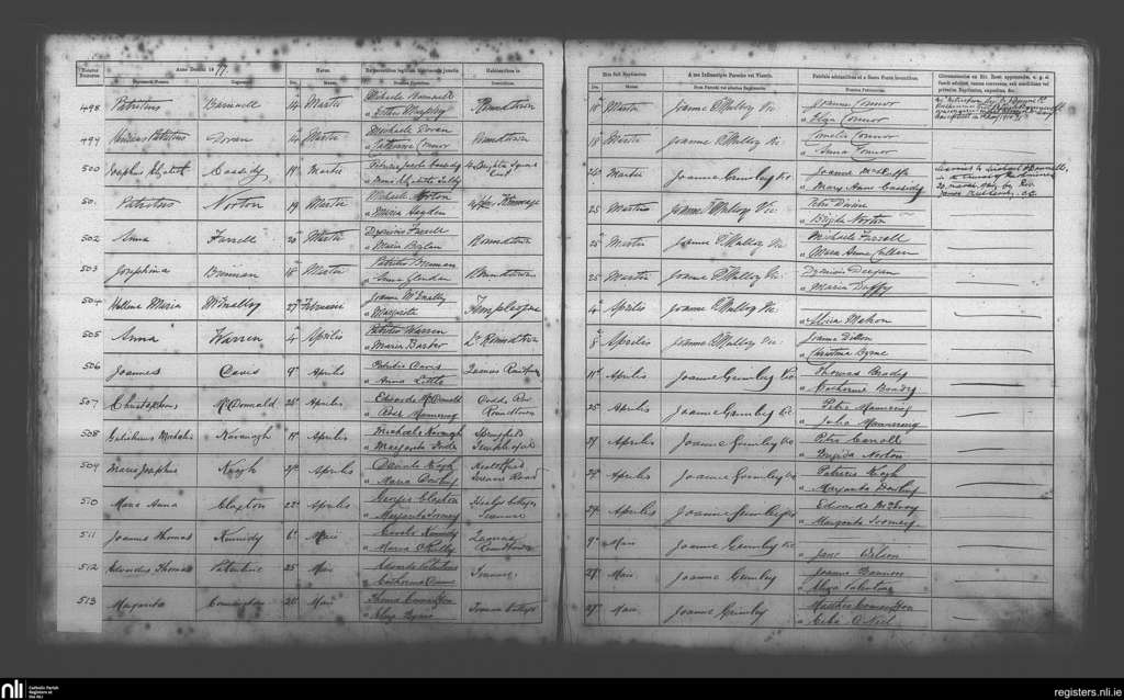 Terenure; County of Dublin; Archdiocese of Dublin. Baptisms, Mar. 1877 to May 1877