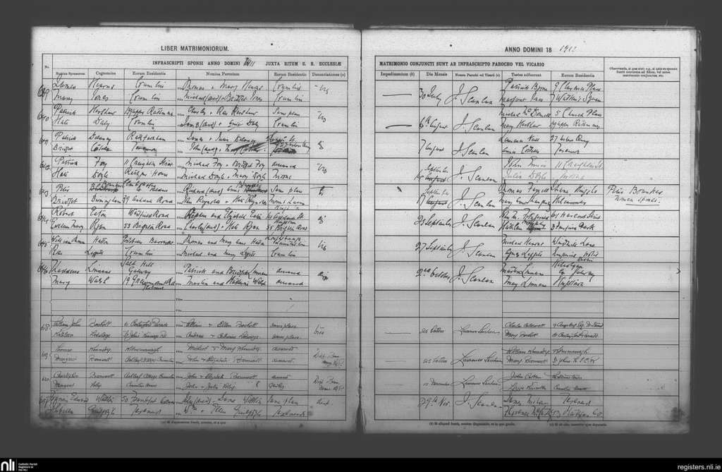 Terenure; County of Dublin; Archdiocese of Dublin. Marriages, July 1911 to Nov. 1911