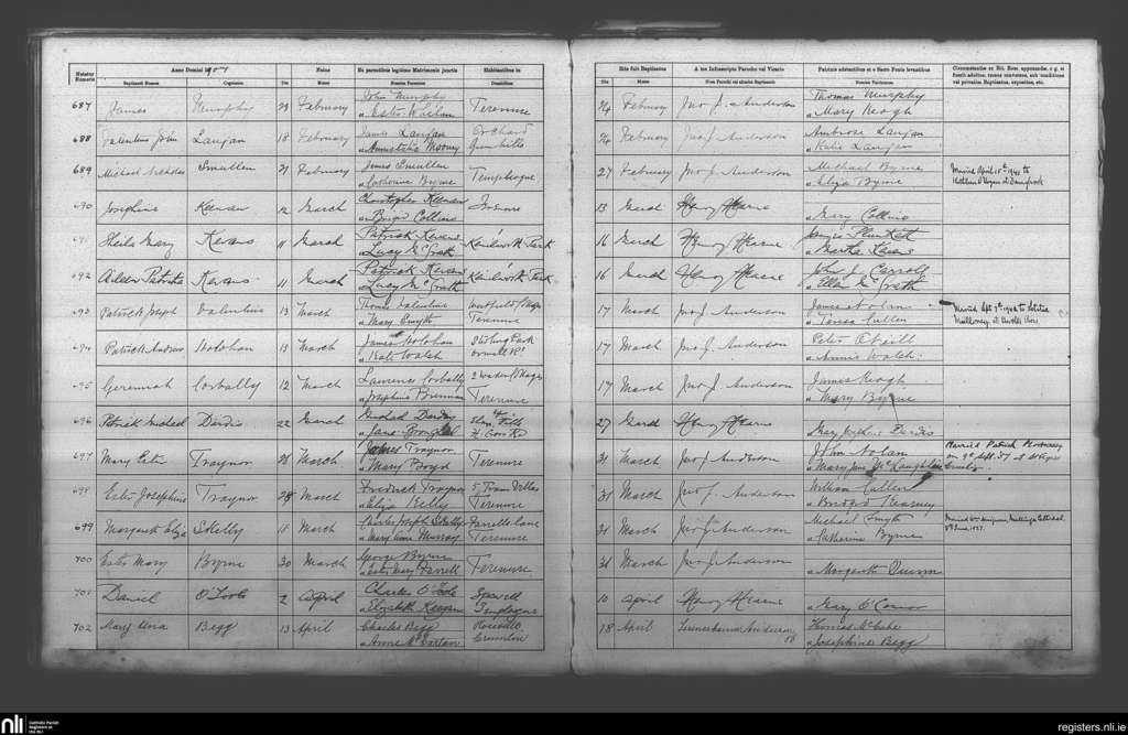 Terenure; Contae Dublin; Ard-Deoise Dublin. Baptisms, Feabh. 1907 go dtí an Aib. 1907