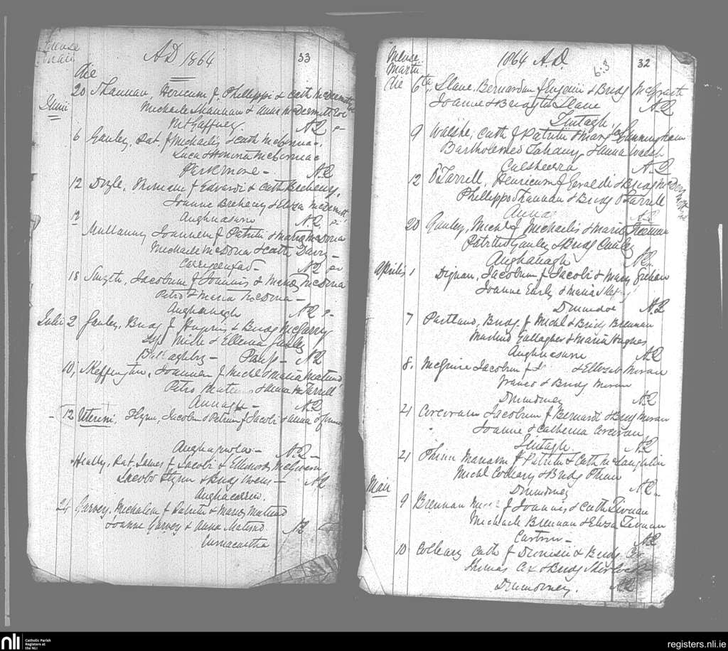 Aughanagh; County of Sligo; Diocese of Elphin. Baptisms, Mar. 1864 to July 1864