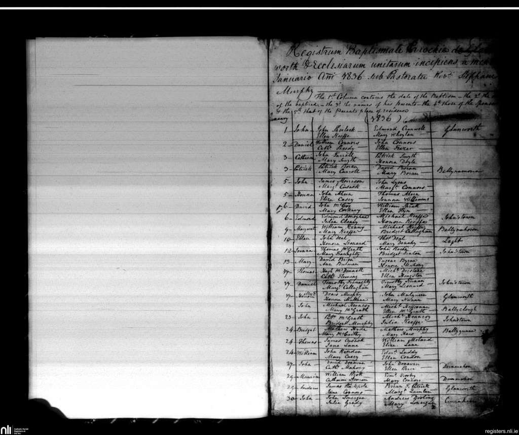 Glanworth and Ballindangan; County of Cork; Diocese of Cloyne. Baptisms, Jan. 1836