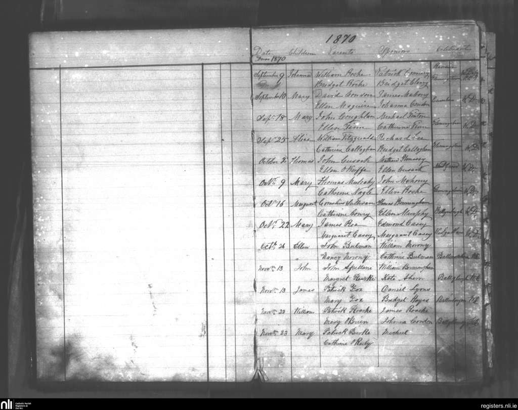 Glanworth and Ballindangan; County of Cork; Diocese of Cloyne. Baptisms, Sep. 1870 to Nov. 1870