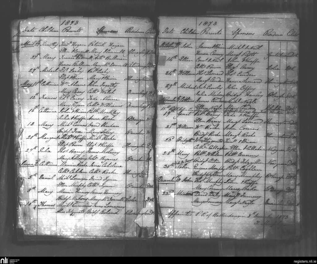 Glanworth and Ballindangan; County of Cork; Diocese of Cloyne. Baptisms, Apr. 1873 to Dec. 1873