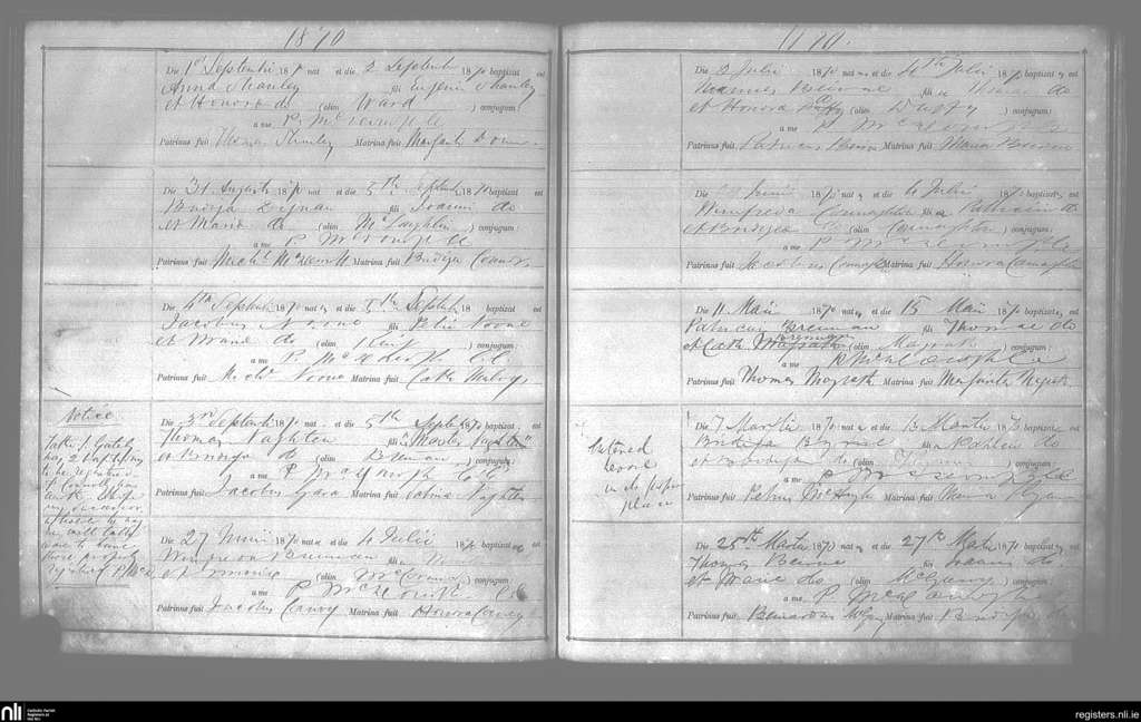 Ballinameen; County of Roscommon; Diocese of Elphin. Baptisms, Mar. 1870 to Sep. 1870