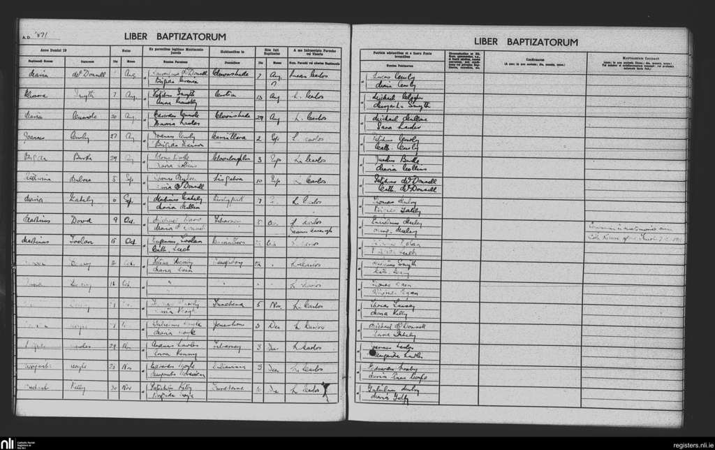 Dysart; County of Roscommon, Galway; Diocese of Elphin. Baptisms, Aug. 1871 to Dec. 1871