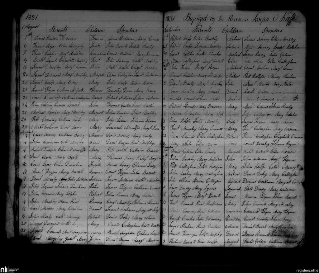 Glountane; County of Cork; Diocese of Cloyne. Baptisms, Aug. 1831 to Nov. 1831