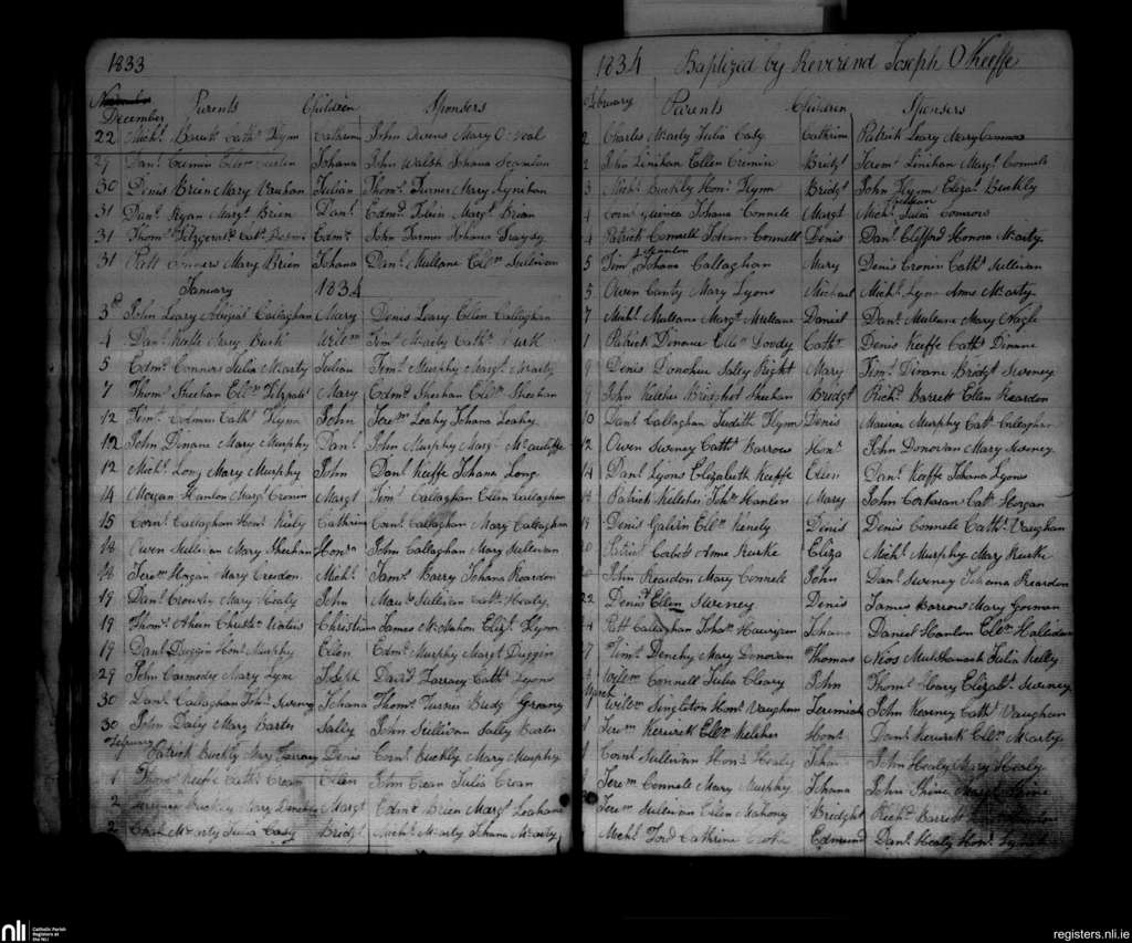Glountane; County of Cork; Diocese of Cloyne. Baptisms, Dec. 1833 to Mar. 1834