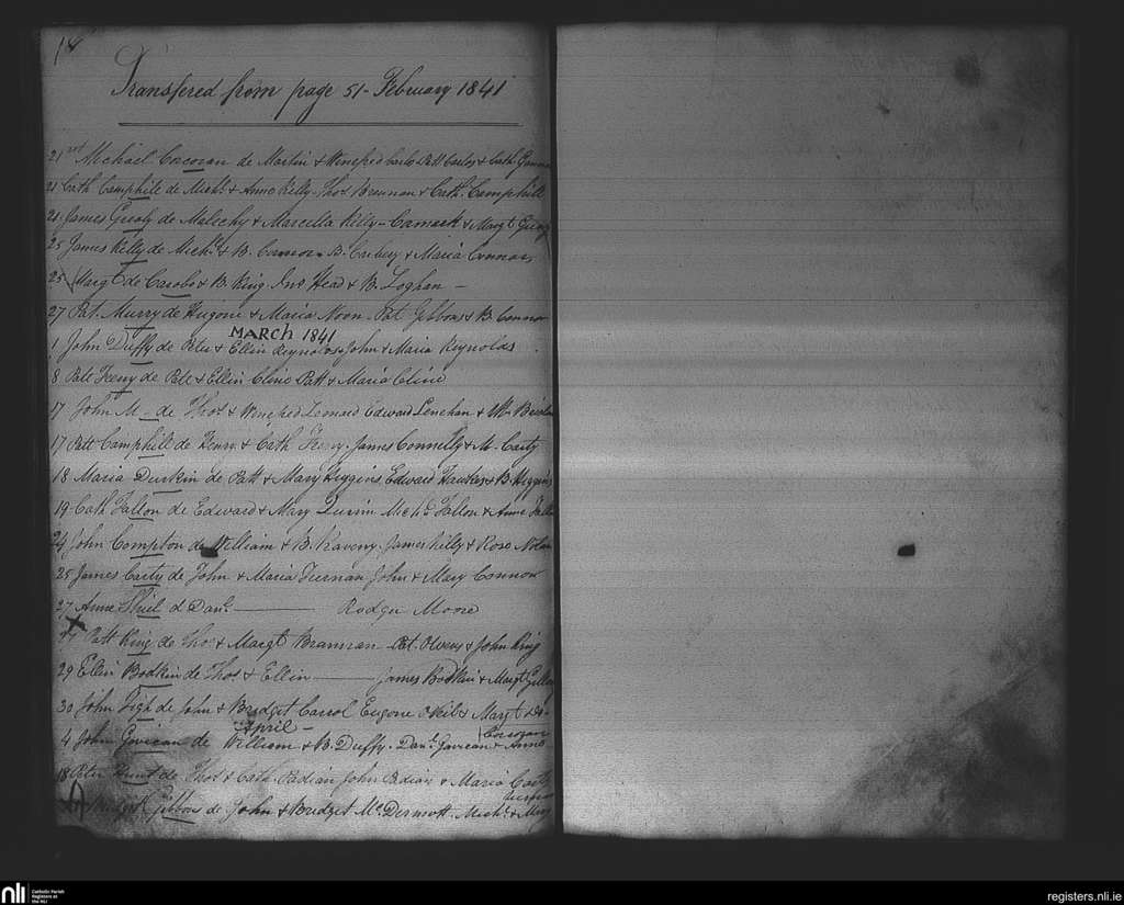 Strokestown; County of Roscommon; Diocese of Elphin. Baptisms, Feb. 1841 to Apr. 1841