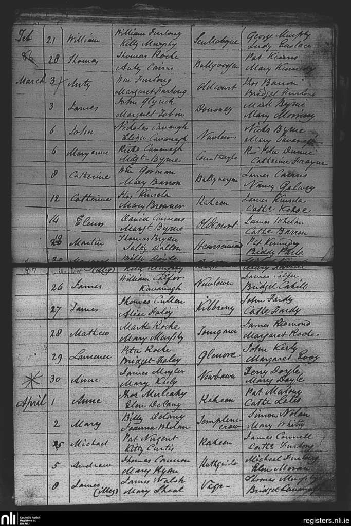 Adamstown; County of Wexford; Diocese of Ferns. Baptisms, Feb. 1843 to Apr. 1843