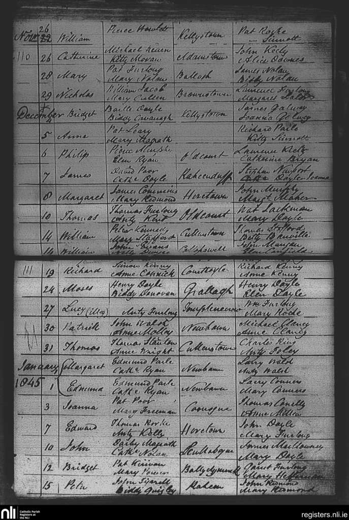 Adamstown; County of Wexford; Diocese of Ferns. Baptisms, Nov. 1844 to Jan. 1845