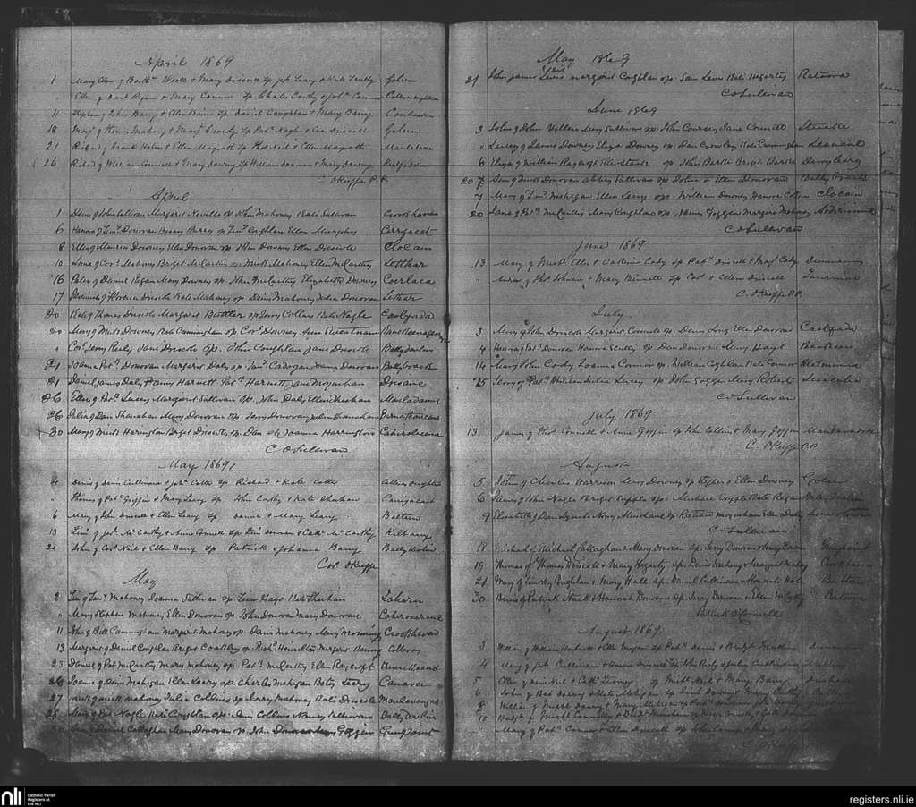 Schull West; County of Cork; Diocese of Cork and Ross. Baptisms, Apr. 1869 to Aug. 1869