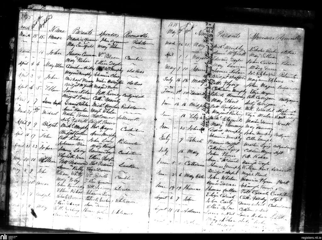 Old Ross; County of Wexford; Diocese of Ferns. Baptisms, Mar. 1875 to Aug. 1875
