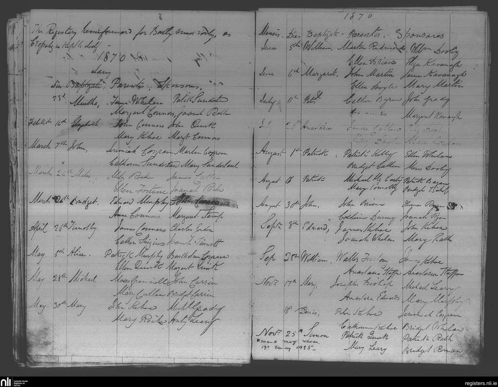 Crossabeg; County of Wexford; Diocese of Ferns. Baptisms, Jan. 1870 to Nov. 1870