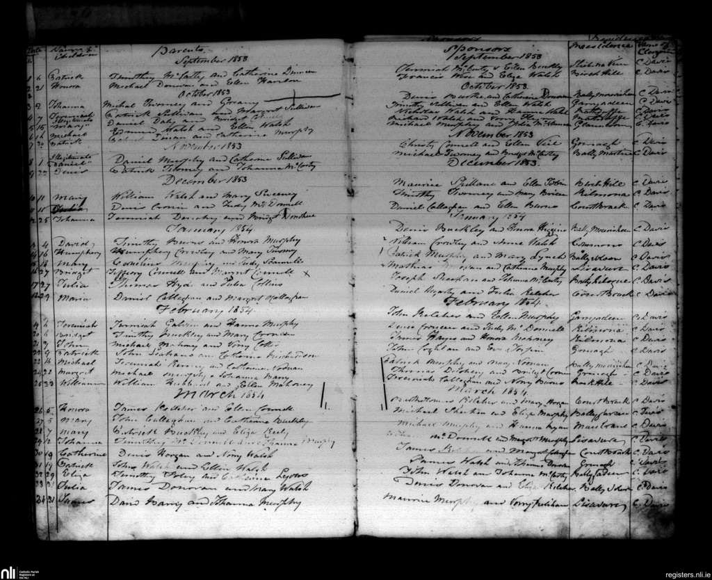 Grenagh; County of Cork; Diocese of Cloyne. Baptisms, Sep. 1853 to Mar. 1854