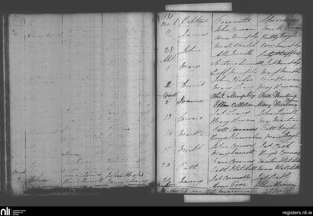 Castlebridge; County of Wexford; Diocese of Ferns. Baptisms, Mar. 1838 to Apr. 1838